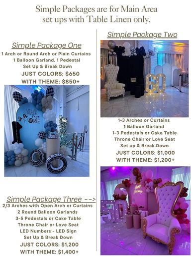 Simple package can be added into full package offer. Please email us a list of everything you need for your event and we will create your discounted package. FemHundraDecor@gmail.com